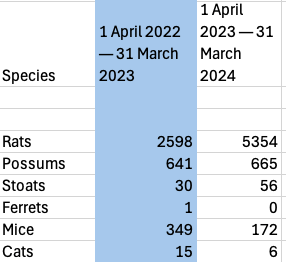 BATS: For a month over Xmas-New Year, (2023-4) we deployed two bat monitors in our area. Analysis of the results show long-tailed bat (pekapeka) presence at one of the locations, on the edge of the wetland. These monitors cannot detect populations, only presence or absence. This was very welcome news. Given the presence of both pekapeka and fernbird/mātātā around the wetland, we are increasing trap density in that area.