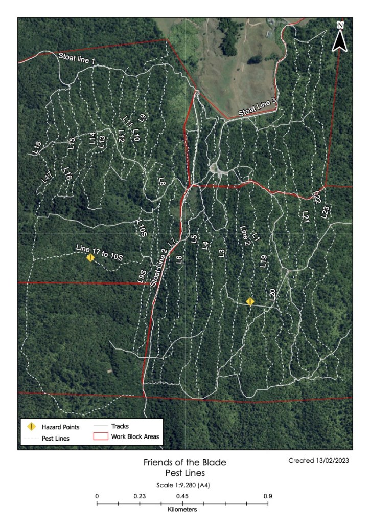 The above photo shows our manual trap-lines. We’ve since added more than 100 AT220 Traps (see photo at the bottom of the page). The organisation is sometimes confusing, but is the result of a steady expansion of the lines, starting, of course, with Line 1, expanding to the west, and later to the east. Our manual traplines are primarily composed of Victor rat traps in bird-proof boxes, Warrior tree-mounted possums traps, DOC 200 and 250 mustelid traps, as well as a few Sentinel possum traps and Goodnature A12s and A24s. The dates of establishment of all 23 lines are as follows: