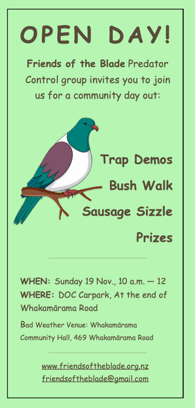 Friends of the Blade / Ngā Hoa o Pā Kererū predator control group invites you to join us for a community day out.