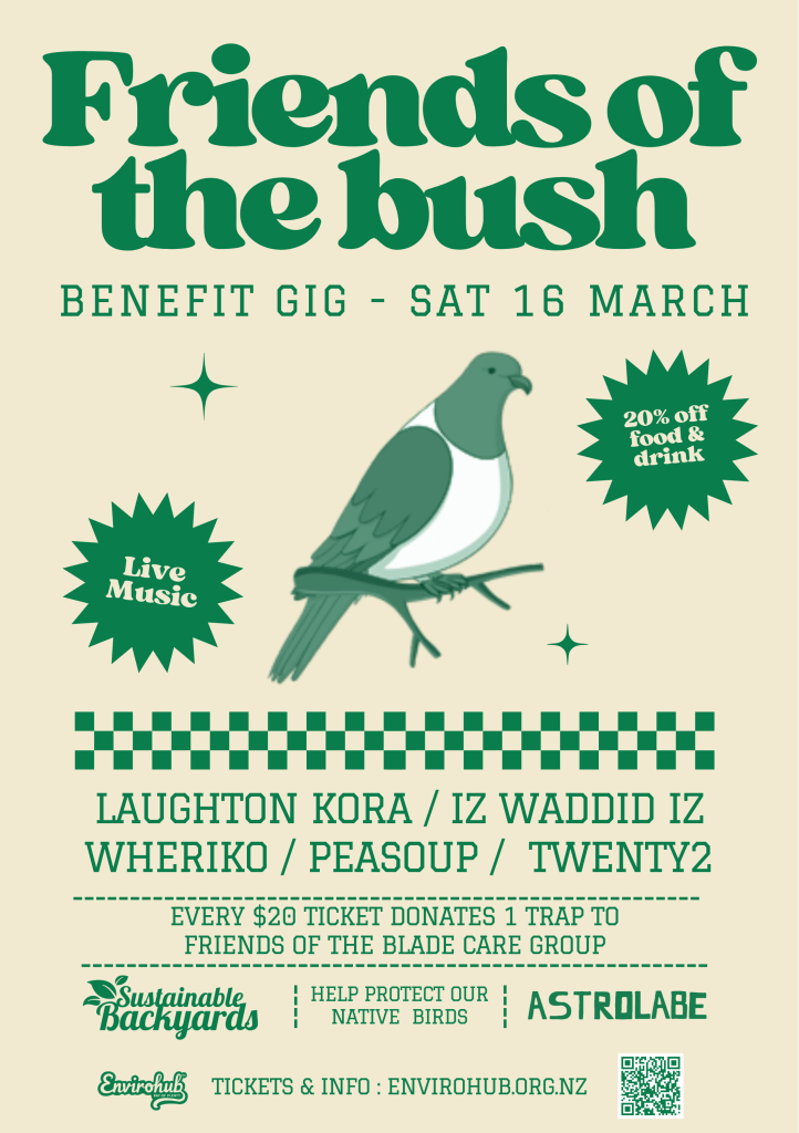 Envirohub’s ‘Sustainable Backyards’ organising team have pulled together a benefit gig to raise money for traps for our predator control work. Huge thanks to them for spearheading this — we’re very excited to take part, and hope all our readers, supporters and volunteers will spread the word, and come along. Here’s a link to the Envirohub event page, and the Facebook event link is here, if you’re that way inclined.