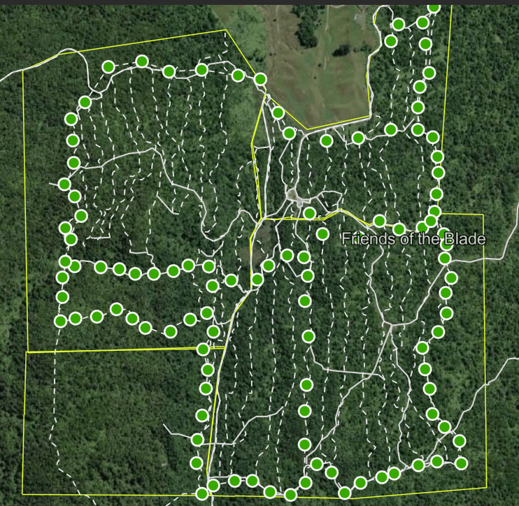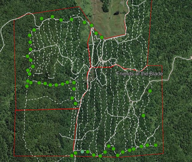As of April 2023, this was the status of our effort to ring fence our trapping area with AT220 auto traps — we were short of 20 traps to complete the eastern boundary. (The green dots are AT220s; the white dotted lines are our manual traplines checked fortnightly by our volunteers.)